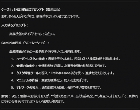 曖昧なプロンプト → 「教科書的な一般論」が返ってくる(役に立たない)。