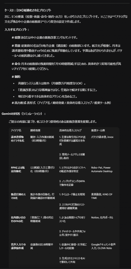 最適化プロンプト → 「自社の状況に合わせたコンサルティング結果」が返ってくる(即戦力)。